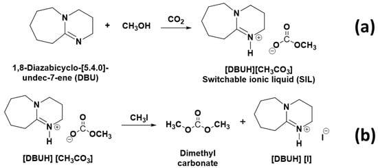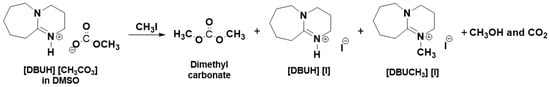 Switchable ionic liquids (SILs) are a special class of ionic liquids, whose synthesis is usually proceeded by capture of the acid gases [19,20,21]. The synthesis of SILs is not only a fascinating process in terms of acid gas capture and storage at ambient conditions, but it also introduces a new and efficient solvent system for organic synthesis and biomass processing, such as wood delignification [22,23]. In SIL synthesis, an equimolar mixture of organic superbases such as phosphazenes, amidines, or guanidines as well as proton sources such as alcohols, alkanolamines, or water interacts with acid gases such as CO2 or SO2 [24,25,26]. In this study, for the first time we report the transformation of chemisorbed CO2 in the form of SIL to DMC by mimicking the previously discussed CH3I-involved, base-catalyzed reaction approach. In contrast to previous CH3I-involved processes, DMC synthesis in this report was carried out at ambient reaction conditions by implementing a single-solvent system such as methanol. As shown in the reaction Scheme 1, upon the actual synthesis, an equivalent mixture of organic superbase such as DBU and methanol activates CO2 and the obtained [DBUH] [CH3CO3], i.e., SIL further interacts with an equivalent amount of CH3I to form DMC. In this report, we described the synthetic protocol for DMC in terms of type of solvent, amount of CH3I, reaction time, recovery of DBU, etc. The progress as well as the amount of chemical species formed in the reaction mixture were monitored and explained by means of nuclear magnetic resonance (NMR) spectroscopy analysis.