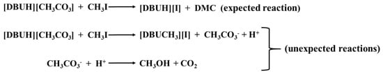 Hence, as shown in the reaction Scheme 1, DMC formed after equivalent interaction between SIL and CH3I. In this case, even though CO2 is a chemically inert species, the highly basic (Brønsted base) characteristics of DBU further facilitated the activation of CO2 under ambient reaction conditions. Further, CH3I has negligible steric hindrance, and since I− is a good leaving group, its interaction with the [DBUH]+ cation and [CH3CO3]− anion of the SIL was further promoted. Hence, as a result of having the reagents with these special chemical characteristics, the overall synthesis proceeded with lower energy consumption in terms of temperature and pressure. However, as described previously, the reaction is not atom efficient, as simultaneous formation of methanol and CO2 also proceeds after decomposition of [CH3CO3]− anions (reaction Scheme 2 and Scheme 3). This side-reaction not only involves the loss of CH3I reagent, but it also releases equally important CO2, which is needed upon DMC synthesis. Since this side-reaction occurred due to the interaction between the [DBUH]+ cation and CH3I, it is necessary to avoid their interaction in order to increase the yield of DMC in this synthetic approach.