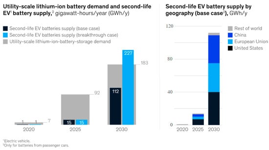 Estimated second-life EV battery supply by region and utility scale demand change between 2020 and 2030 by McKinsey and Company [22]. Exhibit from “Second-life EV batteries: The newest value pool in energy storage”, April 2019, McKinsey & Company, www.mckinsey.com. Copyright © 2021 McKinsey & Company. All rights reserved. Reprinted by permission.