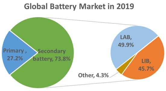 According to the Technavio Market Analysis in 2020 [47], the 2019 global battery revenue percentage breakdown by different chemistry types is shown in Figure 2. Secondary battery systems account for the majority of the global battery market (73.8%) [2]. Closer examination of the secondary battery sector shows that LABs and LIBs account for 49.94% and 45.74%, respectively, of this market share [47]. It is expected that 81.77% of the rechargeable battery market growth will come from LIBs between 2019 and 2024 [47] because of the growing demand globally.