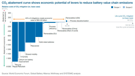 The impact and cost of the improvement in each of the key areas in the closed-loop battery value chain as a function of the carbon abatement cost is visualized in Figure 6 [7]. The negative cost means that circularity and innovation provide solutions that have a better cost performance compared to its base case alternatives. Combining the analyzed levers, the greenhouse gas emission can be reduced from 182 Mt to around 100 Mt at a negative cost.