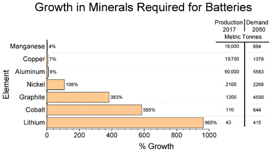 Battery waste is part of the wide range of e-waste and many current battery recyclers are also e-waste recyclers [66]. The EoL batteries, in particular those from small consumer electronic products, are traditionally disposed of, usually in landfills or incinerated to obtain valuable metal components. However, these practices are considered not eco-friendly. Battery waste is an essential source for recovering crucial valuable metals, including lead, lithium, nickel, cadmium, and copper. The global growth in mineral demand is illustrated in Figure 7. The recovery of battery metals from the EoL batteries will reduce the burden on landfills and environmental and human health concerns. Ultimately, the concept of battery recycling has gained prominence because of its well documented economic and environmental benefits.