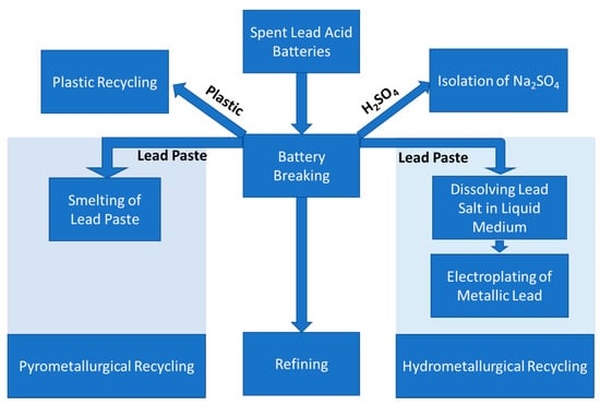 Lead acid battery pyrometallurgical and hydrometallurgical recycling process flow diagram plotted based on reference [6].