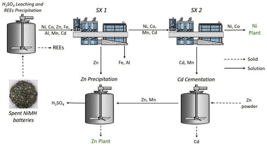 - Agarwal, V.; Khalid, M.K.; Porvali, A.; Wilson, B.P.; Lundström, M. Recycling of spent NiMH batteries: Integration of battery leach solution into primary Ni production using solvent extraction. Sustain. Mater. Technol. 2019, 22, e00121. [Google Scholar] [CrossRef]
