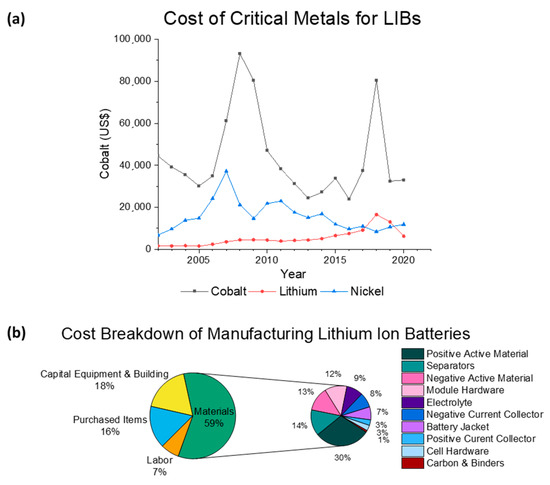 (a) Historical price of cobalt, nickel, and lithium between 2002 and 2020. Data from [85,86]. (b) Cost breakdown by percentage for making lithium ion batteries. Plotted based on reference [87].