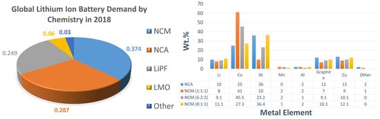 Cobalt, among the other metals present in common cathode formulations, accounts for up to 60% of the cathode cost [81]. The overall cathode material formulation alone counts for 30% of the battery material cost [87]. The cost breakdown for LIBs is shown in Figure 10b. In order to reduce the battery raw material cost, batteries comprising of NCA cathodes with much less cobalt (cf. NMC) andcobalt-free LFP batteries have become more preferable in the LIB market. In particular, LFP is very popular in China which is the biggest market for EVs [23]. Recently, Chinese battery manufacturers such as CATL and BYD, have increased their nickel to cobalt ratio in battery cathode materials to 10:1. Figure 11 shows the market demand for different LIB chemistry in 2018. NMC, NCA, and LFP are the top three chemistry types. The share of NMC is expected to increase up to 48% in the LIB global production by 2025 from 19% in 2018 according to Frost and Sullivan [81]. It is also forecasted by Goldman Sachs Global investment research that nickel-rich cathodes such as NMC and NCA will be in high demand because of the higher energy densities that can be achieved with these mixed metal oxides and will be the mainstream chemistry to gain market share against LFP batteries [24]. The metallic component of NCA and NMC are summarized in Figure 11. For most of the cathode chemistries containing Co and Ni, the recovery makes economic sense. But for cathode materials, such as LFP and lithium manganese oxide (LMO), the constituent metal value is very low according to the metal price listed in Table 1. Another point to consider from the current trend of using cheaper metals for LIB manufacture is that it will make the LIB industrial recycling less profitable in the future under current processing and business models [25]. Except for the above mentioned chemistry shift, another long-term financial concern for the recycling industry are the challenges associated with emerging energy technologies, such as lithium air, or a different vehicle propulsion system, like hydrogen-powered fuel cells. These developments could diminish the growth and impact of the projected EV market in the near future and therefore sustainability of recycling LIBs [27]. For example, in Q4 2017 when the Japanese government and automakers started to promote hydrogen fuel cell vehicles a drop in EV sale from 2018 was observed [80]. However, the current hydrogen fuel cell technology has several barriers to overcome before it can compete with EVs, including high cost and safety issues (hydrogen gas), building hydrogen infrastructure and therefore, companies are still actively investing in R&D to develop alternative low-cost fuel cells [47]. The impact of low cobalt LIBs and possible solutions was discussed by Gaines recently [26] where the profitability of recycling low cobalt content LIBs will depend on the advancement of recycling technology, rely on subsidies and/or government regulations [26].