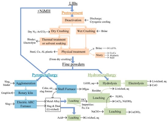 Compared to LABs, NiCd, and mercury batteries, the LIBs are technically considered “green,” since they, as discussed in the environmental impact section, have far lower content of toxic metals [36]. The widespread adoption of LIB technology and a recent sharp increase in LIB demand in consumer electronics (CE) and EVs has, however, lead to environmental and increased financial concerns (valuable battery elements). In particular, cobalt production is concentrated in the Democratic Republic of Congo, which makes it unpredictable and highly susceptible to political risks [76]. Thus, there is growing interest in many countries to implement LIB recycling in recent years.