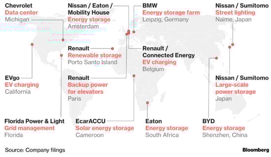 - Stringer, D.; Ma, J. Where 3 Million Electric Vehicle Batteries Will Go When They Retire. Available online: https://www.bloomberg.com/news/features/2018-06-27/where-3-million-electric-vehicle-batteries-will-go-when-they-retire (accessed on 4 February 2021).