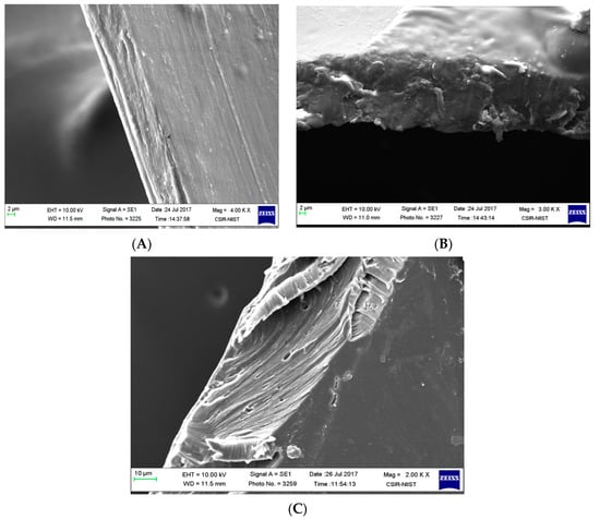 The functionality of a plasticizer can be explained as a molecule with lesser molecular weight and weakened intermolecular interactions between the polymeric chains, thus resulting in a less dense structure with an increased elongation percentage. The physical properties of the above mentioned films are summarized in Table 1. It was observed that the addition of exopolysaccharides to the chitosan solution decreased the tensile strength, the force of elongation, and elongation percentage. However, by adding the plasticizer to the exopolysaccharide blended chitosan films, all properties were found to increase by 39.19% for tensile strength, decrease by 67.38% for the max elongation force, and increase by 94% for the elongation percentage. This was observed as a result of plasticizing chitosan exopolysaccharide blends in comparison to chitosan films. Even the phenomenon was attributed to physical imaging of broken corners in films obtained after mechanical testing (Figure 2). CS films (Figure 2A) have a homogenous appearance and CEPS films (Figure 2B) look a little fragile and less compact. The plasticization with 50% 1,3-propanediol (Figure 2C) in the cross-section of the films looks compact, elastic, and flexible. Even in the literature, hydrophilic plasticizers such as glycerol, ethylene glycol, and polyethylene glycol resulted in brittle films. However, 1,3-PDO plasticized composite films were observed to be intact [23]. Because the CSEPS films were fragile without plasticizers, further physiochemical characterization experiments were carried out using CS and CEPSPDO films.