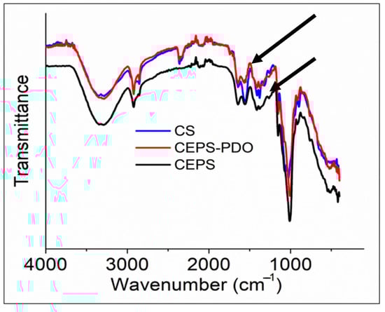FTIR Spectra of chitosan (CS), chitosan exopolysaccharide (CEPS), and plasticized chitosan exopolysaccharide (CEPSPDO) films. The upper arrow corresponds to a peak at 1645 cm−1 and the down arrow corresponds to a peak at 1325 cm−1.