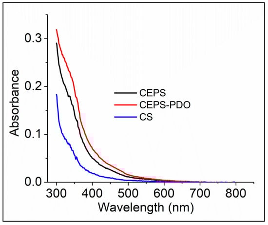 UV-absorbance spectra of chitosan (CS), chitosan exopolysaccharide (CEPS), and plasticized chitosan exopolysaccharide (CEPSPDO) films.