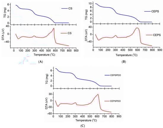 The TGA analysis of CS, CEPS, and CEPSPDO films were carried out to understand the thermal stability and degradation pattern in response to a temperature increase from 30–800 °C at a rate of 10 °C/min. The TGA pattern of films CS (A), CEPS (B), and CEPSPDO (C), are represented in Figure 6. The pattern of thermal degradation in all the films were similar because of the bonding in chitosan and exopolysaccharides, and even the presence of CH2OH groups in chitosan, exopolysaccharide, and 1,3-propanediol. With regard to the three patterns in the degradation pattern, the initial loss rose to 100–105 °C, which represents the removal of water molecules and other volatiles. Until the second mass loss from 250–400 °C, the films were observed to be stable. The second degradation step corresponded to the amine group’s degradation for the chitosan polymer. The film was unstable and there was a gradual decrease in the film’s mass when the temperature reached 600 °C, wherein 100% degradation of the film was observed (Figure 5). The observed results were compared with previous studies using glycerol as the plasticizer. The addition of glycerol as the plasticizer did not have a significant influence on thermal stability. However, 1,3-PDO improved the thermal stability over 50 °C [30].
