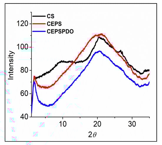 X-ray diffraction analyses are widely used to characterize packing order and crystallinity of materials in all forms. The characteristic X-ray scattering peaks for chitosan films (CS) align with those in the literature [28], where a broad diffraction in the range of 20–21° has been shown due to its intermolecular hydrogen bonding and other van der Waals interactions for polymer chains. A noticeable diffraction peak at 2θ of 9–10° (Figure 7) was believed to occur for a better-ordered arrangement in CS compared to other composite films. Overall, the pattern of the spectrum proved that there was an absence of crystalline structures in the composite films. Three CS, CEPS, and CEPSPDO films were amorphous in structure, and the large area between 2θ of 10–30° represented the films’ moisture content. Although chitosan is semi-crystalline, the composite films prepared are amorphous, which may be due to the solvent casting method’s reorganization. Our results were in agreement with several chitosan and other synthesized composite films [31,32,33,34,35].