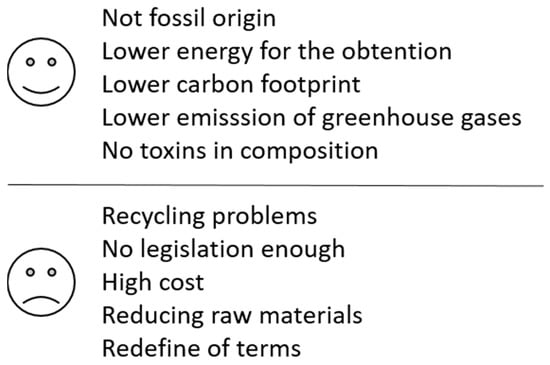 Environmental considerations are the main advantages to use this type of polymers, however, other factors such as the low production capacity compared with the conventional materials, reduces the potential substitution and increases the costs of bioplastics—see Figure 2 for a summary of advantages and aspects to be improved related with bioplastics [17]. Therefore, more efforts must be made to develop sustainable and circular alternatives for preserving resources for future generations, focusing on biodegradable and bio-renewable materials [11].