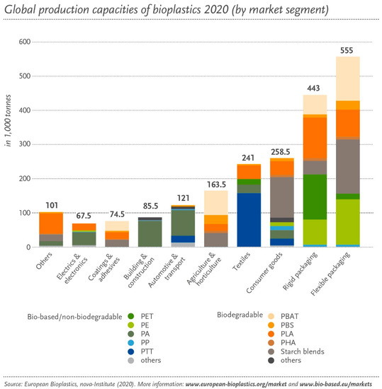Biodegradable plastics by segments (2020) [19] (accessed on 5 March 2021).