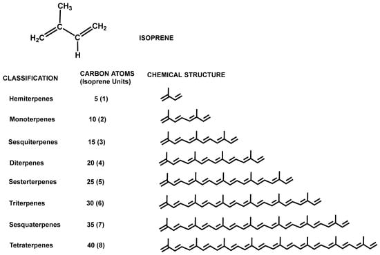 The classification of terpenes and terpenoids follows the so-called isoprene rule (C5 rule), which is based on the number and organization of carbon atoms in the molecule, thus, grouping these molecules according to the number of isoprene units linked in a head-to-tail manner and constituting hemiterpenes (1 isoprene unit), monoterpenes (2 isoprene units), sesquiterpenes (3 isoprene units), diterpenes (4 isoprene units), etc. (Figure 5). Although the head-to-tail configuration is the most common, non-head-to-tail condensation of isoprene units also exists, such as the head-to-middle fusions occurring in irregular monoterpenoids [36]. In addition, isoprene units can conform to chains that can be arranged to form rings.