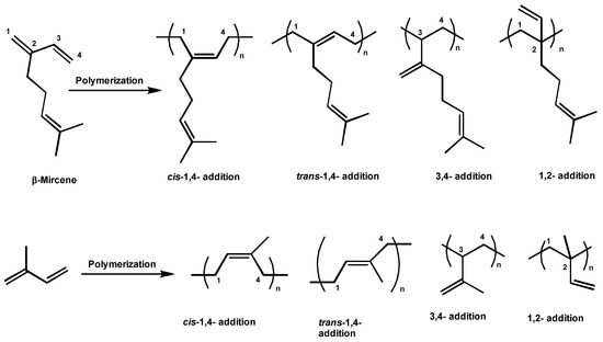From these three isomers, most studies have been focused on myrcene, whose polymerization can happen via anionic, free-radical, coordination, and cationic mechanisms. The polymerization mechanism has a strong influence on the microstructure, which depends on the regioselectivity of the addition as there are four different possibilities for myrcene: 1,4 (cis or trans), 3,4, or 1,2, although the formation of the 1,2 unit is less favored probably due to the steric hindrance of the double bonds (Scheme 1). Since the polymer properties can be tuned by controlling the microstructure, to be able to perform a controlled polymerization is of great interest [78]. It should be noted that the poly-β-myrcene shows similar features to polyisoprenes, in particular, in terms of Tg and mechanical properties as they are mostly elastomers. Moreover, myrcene provides an additional double bond in its alkyl tail, which is very suitable for crosslinking or post-functionalization reactions [79].