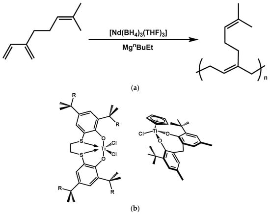 (a) Polymerization of β-myrcene with [Nd(BH4)3(THF)3]/MgnBuEt in toluene [88], adapted with permission from Visseaux et al., J. Polym. Sci. Part A Polym. Chem., published by Wiley, 2012. (b) Titanium catalysts for myrcene polymerization [90], adapted with permission from Capacchione et al., Polymer, published by Elsevier, 2017.