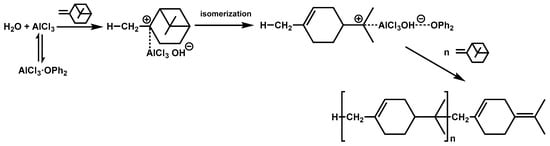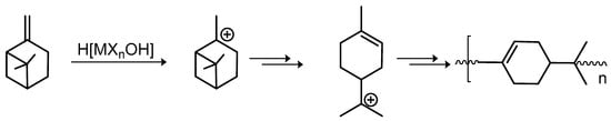 For pinene, both isomers α- and β- can be polymerized but β-pinene reacts more readily due to facile ring opening and the relief of ring strain. Pinene polymerization gives terpene resins that can be used as thermoplastics, coatings pressure-sensitive adhesives, or tackifier additives. They are more expensive than petrol-based ones but their unique properties justify their higher cost [98]. For the cationic mechanism, some limitations have been reported, for example, high catalyst loadings, incremental monomer additions, or cryogenic conditions are required to achieve reasonable molecular weights. Lewis acids such as metal chlorides are often used as initiators [99,100,101]. For them, the activity of the catalysts depends on the strength of the Lewis acidity, and the effectiveness decreases in the order: AlBr3 > AlCl3 > ZrCl4 > AlCl3·Et3O > BF3 > BF3·Et2O > SnCl4 > SbCl3 > BiCl3 > ZnCl2. The presence of adventitious water favors the process since the formation of intermediate species, such as HMXnOH, from the reaction between the Lewis acid and water is considered the first step of the reaction (Scheme 3). The transfer of the proton to the monomer to generate a cyclic carbocation, which then isomerizes, is a key step in the polymerization, as the less encumbered carbanion ion is responsible for the polymerization propagation [96,102]. The final polymer presents a structure of an alternating copolymer of isobutylene and cyclohexene.