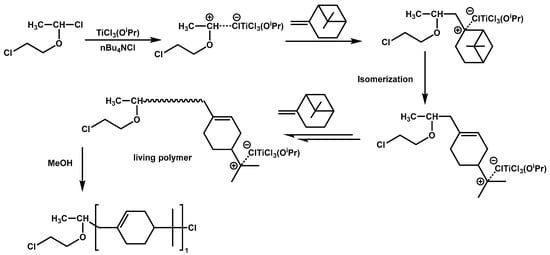 In this direction, Deng published the living cationic polymerization of β-pinene using as Lewis acid a titanium compound [TiCl3(OiPr)] combined with an HCl-2-chloroethyl vinyl ether adduct [CH3CH(OCH2-CH2Cl)Cl] and tetra-n-butylammonium chloride (nBu4NCl) (Scheme 4). This catalytic system allows the formation of poly(β-pinene) with controlled molecular weights (up to 4000 Da), narrow molecular-weight dispersities (~1.3), and controlled chain-end groups [104].