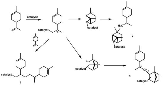 Another acyclic terpene whose polymerization has been studied is limonene. In fact, limonene is a popular platform chemical, and although in recent years many studies have been reported, very few are focused on its polymerization and mainly refer to radical or cationic mechanisms [114]. In comparison to other terpenes, limonene presents not very accessible and unconjugated C=C double bonds, hence the polymerization to afford polymers with high molecular weight is not easy. There were some early studies sixty years ago, and since then most of the works have been reported as patents. The initial studies of cationic polymerization used TiCl4 or BF3·OEt2 as Lewis acid catalysts [104]. In addition, AlCl3 is an active catalyst, although the polymers obtained had low molecular weights (~1000–1200 Da) [116]. In Scheme 6, the proposed cationic polymerization mechanism is shown, where chain growth takes place via the addition of the cationic propagating species to the exocyclic C=C double bond. In the mechanism, the bicycle type structures (2 and 3) are more favored than the monocyclic ones (Scheme 6).