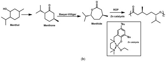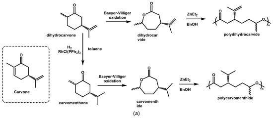 Further, it is also possible to transform some terpenoids into monomers suitable to generate terpene-based polymers, such is the case of carbon and menthol [50]. In both cases, the transformation into lactones, via a Baeyer Villager process, is feasible. From these oxygenated cycles, polymers with high molecular weights and moderate to low ĐM can be obtained via ring-opening polymerization (ROP) (Scheme 7) [123,124,125]. Also, a derivative of carbon has been polymerized by a cationic mechanism by previous transformation of the cyclic α,β-unsaturated carbonyl group into a conjugated transoid cyclic diene with an exo-methylene group via the Wittig reaction [126]. The resulting monomer was efficiently polymerized, in a controlled way, using initiating systems that produce regioselective 1,4-conjugated additions of vinyl ethers in a living manner.