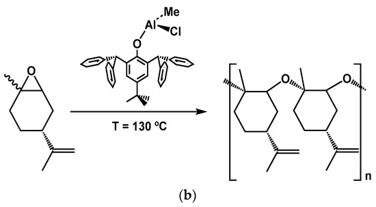 For both terpenes, pinene, and limonene, copolymerization via a cationic mechanism has been reported. In the case of α- and β-pinene with styrene, these produce well-controlled architectures: block, random, grafted, and end-functionalized polymers [117,118,119]. For limonene, copolymerization with methyl methacrylate, maleic anhydride, styrene, or acrylonitrile has been described [115,120,121].