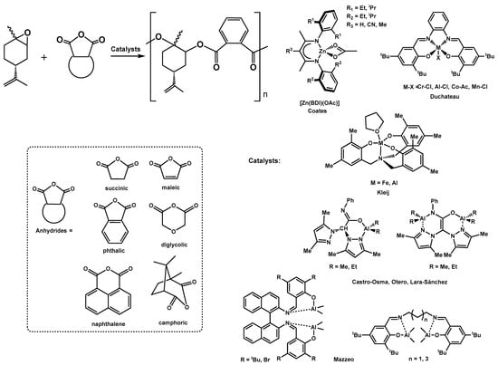 - Nejad, E.H.; Paoniasari, A.; van Melis, C.G.; Koning, C.E.; Duchateau, R. Catalytic Ring-Opening Copolymerization of Limonene Oxide and Phthalic Anhydride: Toward Partially Renewable Polyesters. Macromolecules 2013, 46, 631–637. [Google Scholar] [CrossRef]