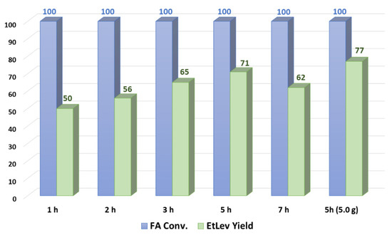 Several experiments were carried out varying the reaction time; FA ethanolysis was carried out for 1, 2, 3, 5, and 7 h after the reaction mixture reached the operating temperature of 80 °C; the results achieved are depicted in Figure 2.