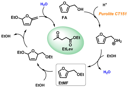 Figure 3 reports a possible reaction mechanism for the formation of EtLev from FA. A comprehensive investigation on the alcoholysis of furfuryl alcohol is still lacking, most likely due to the difficulties in identifying all the concurrent synthetic pathways and the related reaction intermediates; thus, further investigations are needed to clarify these aspects.