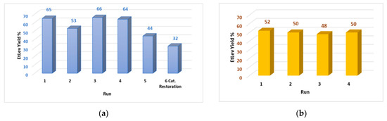 (a) Recycling of the catalyst Purolite CT151; FA (1.0 g, 10.19 mmol), EtOH (20 mL), Purolite CT1515 (100% wt.) at 80 °C for 5 h. (b) Recycling of the catalyst Purolite CT151 and of the exceeding ethanol; FA (5.0 g, 50.9 mmol), EtOH (100 mL), Purolite CT1515 (100% wt.) at 80 °C for 5 h.
