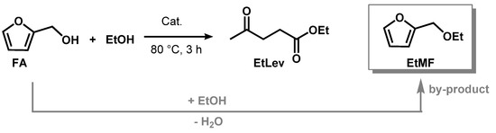 Ethyl levulinate (EtLev) was selected as a model compound to test the efficiency of the heterogenous and homogeneous catalysts for the alcoholysis of furfuryl alcohol (Scheme 1, Table 1).