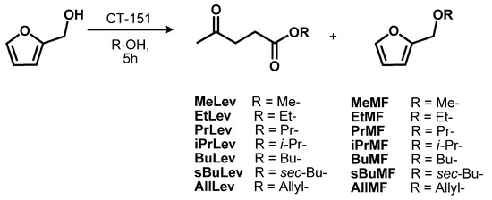 In a 250 mL round bottom flask equipped with a water condenser and a magnetic stir bar, furfuryl alcohol (5.0 g, 50.9 mmol) was dissolved in 100 mL of the corresponding alcohol in presence of CT151 (2.5 g, 50% wt.) as heterogeneous acid catalyst. The reaction mixture was heated at solvent reflux temperature for 5 h under magnetic stirring. Afterwards, the reaction was cooled to room temperature and the mixture was filtered on a layer of basic alumina and washed with a minimum amount of acetone. The organic phase recovered was transferred (in two tranches) to a 100 mL double-necked round bottom flask equipped with distillation apparatus; the solvent was distilled at atmospheric pressure. In order to completely remove any solvent residue, the mixture was transferred into a 25 mL double-necked round bottom flask equipped with distillation apparatus connected to a vacuum pump (40–60 mbar). The alkyl levulinates were then purified through distillation at reduced pressure as transparent or light-yellow liquids (Table 4).