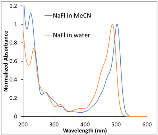 Examination of absorption spectra for NaFl, recorded in two different solvents, revealed a shift of approximately 10 nm at peak maxima (Figure 1). A bathochromic shift of NaFl peak maxima in MeCN was observed, which is consistent with previously reported work [16]. This shift is very well correlated with the α and β parameters of Kamlet and Taft [31,32]. The absorption spectra of NaFl in water, a protic solvent, exhibited an absorption peak maxima at shorter wavelength, which was attributed to hydrogen bonding in comparison to MeCN, an aprotic solvent with no tendency to hydrogen bond [18].