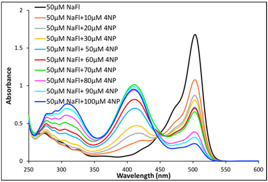Absorbance spectrum of 50 µM of NaFl in presence of different concentrations of 4NP in water.