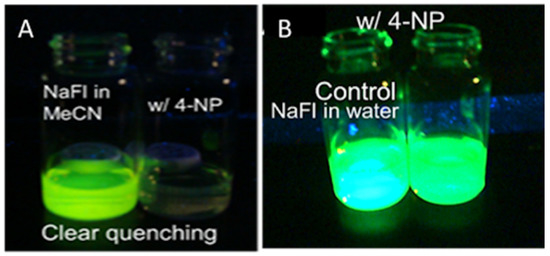 The fluorescence emission of NaFl under UV lamp in MeCN (A) and water media (B) when 4NP was added.
