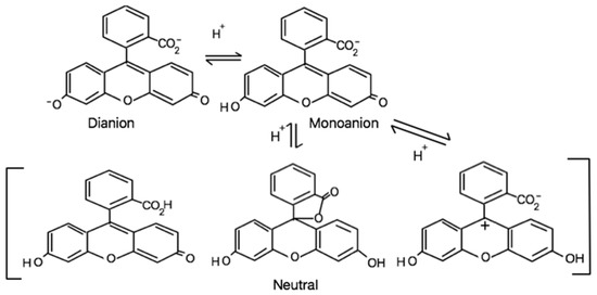 NaFl is a highly fluorescent, reasonably photostable, and biocompatible xanthene dye [16,17,18]. Since the late 1900s, NaFl has been widely employed to locate tumors or abnormal tissues using the naked eye with UV light in ophthalmic [19] and neuro-oncologic surgery [20]. In aqueous solution, fluorescein exists in different prototropic forms (as depicted in Scheme 1) under various pH conditions that exhibit very different photophysical properties [18,21]. The spectral properties of the dianion species significantly depends on the hydrogen bonding environment [22]. The dianion form of fluorescein is highly fluorescent as compared to the monoanionic form while the neutral form is nonfluorescent [23]. However, there is at least one report that concludes that among three conformations of the neutral form, one neutral fluorescein specie exhibits some fluorescence characteristics with a quantum yield value of 0.29 [24]. Significant changes in the photophysical properties of NaFl are directly correlated to the neutral, monoanionic, and dianionic forms of fluorescein. Therefore, these properties have been previously used to create a wide variety of optical pH sensors employing fluorescein [25,26].