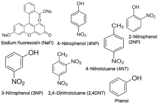 NaFl, four nitroaromatic pollutants, i.e., 4-NP, 3-nitrophenol (3NP), 4-nitrotoluene (4NT), 2-nitrophenol (2NP), phenol, and 2,4-dinitrotoluene (2,4DNT) were purchased from Sigma-Aldrich and used as received. The structures of NaFl and the nitroaromatics are given below in Scheme 2. MeCN was purchased from J.T. Baker. Triply deionized (DI) water (18.2 MΩ cm) was obtained by use of an Elga model PURELAB ultra water-filtration system. Laboratory grade hydrochloric acid (HCl), sodium hydroxide (NaOH), and chloroform were purchased from VWR. N,N-dimethylformamide (DMF) was obtained from Alfa Aesar. Tetrahydrofuran (THF) and chloroform were purchased from Sigma-Aldrich (St. Louis, MO, USA).