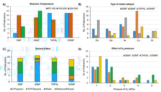 Catalytic hydrogenation of the aldehyde group and the furan ring did not require high reaction temperatures. Therefore, the catalytic transformation of FUR and HMF to THFAL and BHMF could be achieved at reaction temperatures around 100 °C. On the other hand, hydrogenolysis of the C–O bond is promoted at a higher temperature. The preparation of 2MeF and DMF typically requires a reaction temperature range of 100–200 °C. Synthesis of 2MeF and DMF above 200 °C was also reported in the literature (Figure 1A). Both noble and non-noble catalysts were found effective for the hydrogenation and hydrogenolysis steps. Among the noble metal catalysts, palladium and platinum are the most commonly used, whereas copper and nickel are the most popular non-noble-metal catalysts for the catalytic hydrogenation of furanic compounds (Figure 1B). The copper-based catalysts were found effective for the hydrogenation of aldehyde and the hydrogenolysis of C–O bond and used extensively to prepare 2MeF from FUR. Palladium catalysts were also effective for the hydrogenolysis reaction and used for making DMF from HMF. Palladium and nickel-based catalysts were effective for the hydrogenation of furan rings and favored the formation of THFAL from FUR. The ruthenium-based catalysts were also effective for reducing the carbonyl group and used to prepare DMF from HMF. The solvent used in the hydrogenation reactions greatly influences selectivity toward a specific furanic product. Solvent influences the hydrogen bonding of substrate and solubility of H2 gas. Alcohols are routinely used as a green solvent for catalytic hydrogenation reactions. In some cases, the alcohol solvent also acts as the hydrogen donor. 2-Propanol is the most frequently employed hydrogen-donor alcohol for CTH due to its bulk availability, inexpensiveness, recyclability and low toxicity. Water is also a frequently used solvent for catalytic hydrogenation reactions. The insolubility of many hydrogenated furanic compounds in water allows isolating the products by simple phase separation without employing an organic extractant. Ethers such as 1,4-dioxane have also found use in the hydrogenation reaction (Figure 1C). The H2 pressure in the range of 1–2 MPa was proved as optimal for the hydrogenation of FUR and HMF (Figure 1D). The requirement of H2 pressure is very much dependent on the type of metal catalyst employed. Noble-metal catalysts typically require lesser hydrogen pressure compared to non-noble metal catalysts. In general, the hydrogenation of aldehyde to a hydroxymethyl can be carried out using 1 MPa or less.