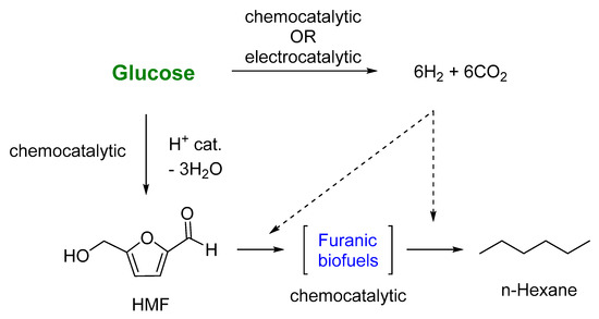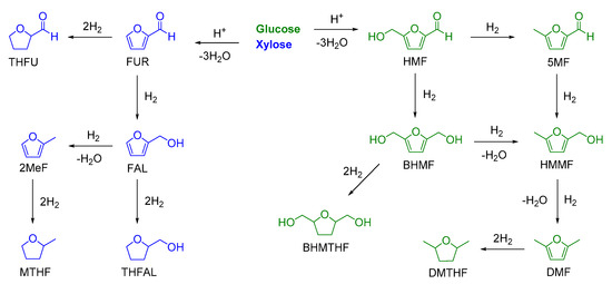 Adopting biomass-derived fuels and chemicals would help relieve the economic and environmental distresses triggered by the excessive use of petrofuels and petrochemicals [1]. Furthermore, the suitable integration of renewable, carbon-neutral biomass in the chemical industry would be an indispensable step toward their long-anticipated sustainability [2,3]. However, selecting the biomass feedstock is critical to not compete with the animal and human food supply chain [4]. In this regard, cellulosic biomass has been considered as a suitable feedstock to produce fuels and chemicals [5]. Only a fraction of around 180 billion tons of lignocellulosic biomass produced annually in the world is utilized [6]. The major challenge in the value addition of biomass is to selectively depolymerize, defunctionalize and deoxygenate the biopolymers into simple molecules with desired structural features and physicochemical properties [7,8]. In this regard, the catalytic value addition of biomass is advantageous since the processes are fast, selective, biomass independent and the chemical industries are well-versed with the catalytic processes [9,10]. The acid-catalyzed hydrolysis of cellulose and lignocellulose fractions into sugars followed by dehydration of the latter into furanics such as furfural (FUR) and 5-(hydroxymethyl)furfural (HMF) are well-documented in the literature [11]. The sequential elimination of three molecules of water from a molecule of glucose forms HMF under acid catalysis [12]. The elegant process decreases the oxygen content of glucose by 50 mol% without cleaving C-C bonds or producing toxic byproducts. Similarly, the acid-catalyzed dehydration of xylose, a major constituent sugar in the pentosans, produces FUR [13]. Both FUR and HMF can access various synthetic value addition pathways with several established and emerging commercial markets for their derivatives [11]. The removal of all the oxygen atoms from a mole of glucose by combining catalytic hydrogenation and hydrogenolysis reactions requires seven moles of hydrogen and leads to n-hexane (Scheme 1) [14]. The process can be contemplated as a renewable production of naphtha-range hydrocarbons. On the other hand, the combination of acid-catalyzed dehydration and catalytic hydrogenation of glucose can lead to more valuable furanic chemicals via the FUR and HMF intermediates [15,16]. The value addition of cellulosic biomasses via the furanic platform allows to preserve some of the crucial functionalities in the sugar moiety and exploit them for synthetic upgrading.