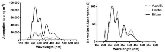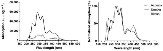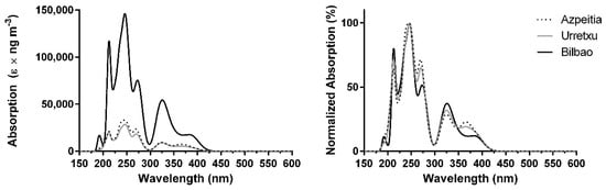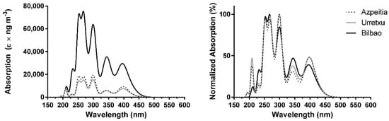 Combined theoretical absorption spectra of PAHs, corrected for their experimental mean concentrations, over Azpeitia, Urretxu, and Bilbao using B3LYP/6-31+G(d,p) [33,34]. (left) absolute values; (right) normalized values.