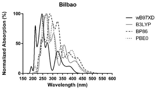 In summary, the absorption spectra of PAHs are qualitatively similar for all locations (Bilbao, Azpeitia, and Urretxu) regardless of the employed functional, with the absorption intensities being similar in the Gipuzkoa region but significantly lower than in Bilbao. The main difference is the position in the bands. Figure 5 presents the normalized absorption spectrum over Bilbao (as a representative example) calculated with all functionals. We can see that the number and shape of the bands are similar, with each functional simply shifting the maximum wavelength. For example, we can see that the band computed by ωB97XD at ~380 nm corresponds to the band found at ~400–425 nm (Figure 5). Similarly, the bands found at ~380 (BP86), ~360 (B3LYP), ~345 (PBE0), and ~325 nm (ωB97XD) should correspond to the same maximum wavelength (Figure 5). The bands at ~330 (BP86), ~305 (B3LYP), ~300 (PBE0), and ~275 nm (ωB97XD) should correspond to the same band in the real-world absorption spectra. The same can also be said for the bands found in the UVC region. Given these data, there is general agreement between the calculations with different functionals that stronger light absorption occurs in the UVC and UVB regions, with more moderate absorption in the UVA region and weaker absorption in the visible region.