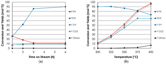 As a preliminary study, the effect of the time on stream on the short-term stability (e.g., 6 h) was investigated using Al/P/O, the phosphate with the higher density of acidic sites. Figure 1a shows the outcome of the ketonization of propionic acid (PA) to 3-pentanone (3-P), carried out in the gas phase at 300 °C, with a feed molar percentage of PA in N2 equal to 6%, and a time factor (W/F, calculated by dividing the mass of the catalyst by the total volumetric flow at reaction temperature) equal to 0.8 s·g/mL. Results of this test are expressed in terms of conversion of propionic acid (X PA), products yield (Y), and molar balance (YS/X = sum of yields divided by conversion).