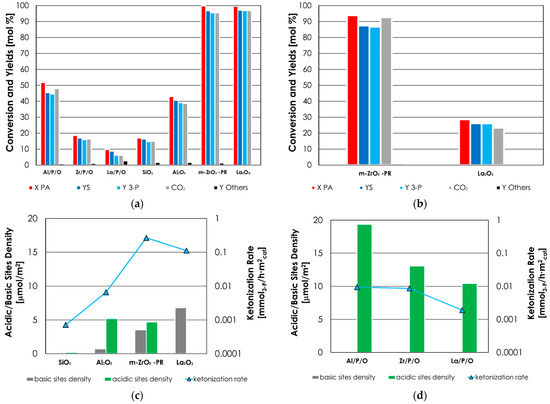 The order of activity of metal oxides (inferred from the intrinsic ketonization rates listed in Table 2) was m-ZrO2-PR > La2O3 > Al2O3 > SiO2. This outcome matched quite well the activity orders reported previously in the literature [33,34] and was correlated to the surface acid-base properties of metal oxides (determined by means of CO2- and NH3-TPD), as shown in Figure 2c.