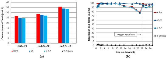 Complete PA conversion and selectivity towards 3-P > 95% were maintained for roughly 11 h, then PA conversion slowly decreased, reaching ≈ 80% after 21 h on stream. Therefore, it should be noted that m-ZrO2-HT lacks the long-term stability required by industrial operations.