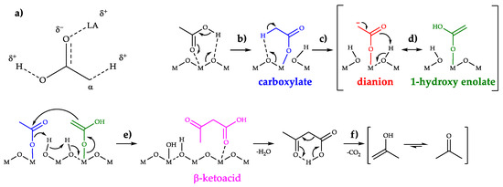 It has been demonstrated that both basic and acidic sites are involved in ketonization [48], and it is largely accepted that the most active sites consist of strong, adjacent Lewis acid-base pairs [10,32]. Lewis acidic sites (e.g., coordinatively unsaturated metal cations) can interact with the oxygens of the carboxylic group as shown in Scheme 2a, enhancing the acidity of both the carboxylic proton and the α-proton, thus favoring their abstraction by adjacent basic sites (e.g., oxygen anions). On the other hand, once the carboxylic proton and the α-proton are abstracted by vicinal oxygen atoms (Scheme 2, reactions b and c), acidic sites are needed to coordinate and stabilize the resulting nucleophilic species (e.g., dianions or 1-hydroxy-enolates, as shown in Scheme 2, reactions c and d, respectively) long enough to allow them to react with another carboxylate anion producing the β-ketoacid intermediate (Scheme 2, reaction e). At the temperatures at which ketonization usually occurs, β-ketoacids are unstable and immediately undergo a decarboxylation via a six-membered cyclic transition state, leading to an enol that readily tautomerize to the corresponding ketone (Scheme 2, reaction f).