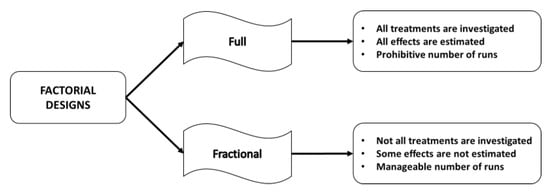 When the number of factors is particularly high, the experiment becomes too expensive or time and resources consuming to be performed because the number of required runs to investigate all possible treatments rapidly increases. In these cases, the experimenter can decide not to run all possible treatments, focusing on a suitable subset of the runs, by planning a fractional factorial design [] instead of a full factorial design [] (see Figure 2).