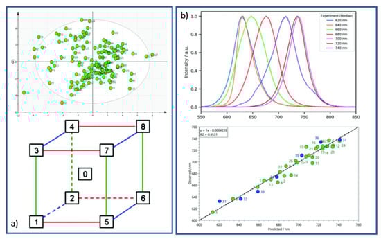 (a) The PCA solvent map (top panel) and the cuboid representing the solvent space (bottom panel) (reproduced from Ref. [] with permission from the Royal Society of Chemistry). (b) The perovskite photoluminescence model validation experiment described in the text, where both S1-normalised PL emission (top panel) and observed vs. predicted wavelength PL, showing design experiments in green and validation experiments in blue (bottom panel), are presented (reproduced from Ref. [] with permission from the Royal Society of Chemistry).