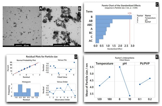 DoE for the investigation of the main reaction parameter responsible for the nanoparticle size increase under hydrothermal synthesis conditions. Minitab was used for the data analysis and model generation. (A) TEM micrograph of Pt NPs obtained with the optimised reaction parameters. (B) TEM micrograph of Pt NPs obtained at the beginning of the study. (C) The Pareto Chart is reported, ranking the significance of the different effect as analysed by Minitab. (D) The Residual plot is also reported, providing an overview of the generated model to fit the experimental results and presenting the homoscedasticity of the residuals vs different variables. (E) The Factor’s interaction plot is reported, providing an overview of the impact of the different factors on the overall mean particle size. (Portions of information contained in this publication/book are printed with permission of Minitab, LLC. All such material remains the exclusive property and copyright of Minitab, LLC. All rights reserved. Minitab, LLC (2021), www.minitab.com) (accessed on 29 December 2021).