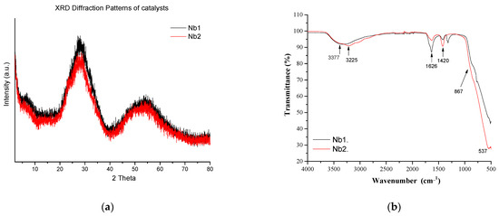 Figure 1a shows the XRD patterns of both photocatalysts: Nb1 and Nb2. Both XRD patterns show the presence of two broad peaks located at 27° and 53°; these enlargements are characteristic of amorphous niobium oxides, as also found by Marin et al. [32] and Brandão et al. [33], who obtained niobium oxide through other synthesis methods.